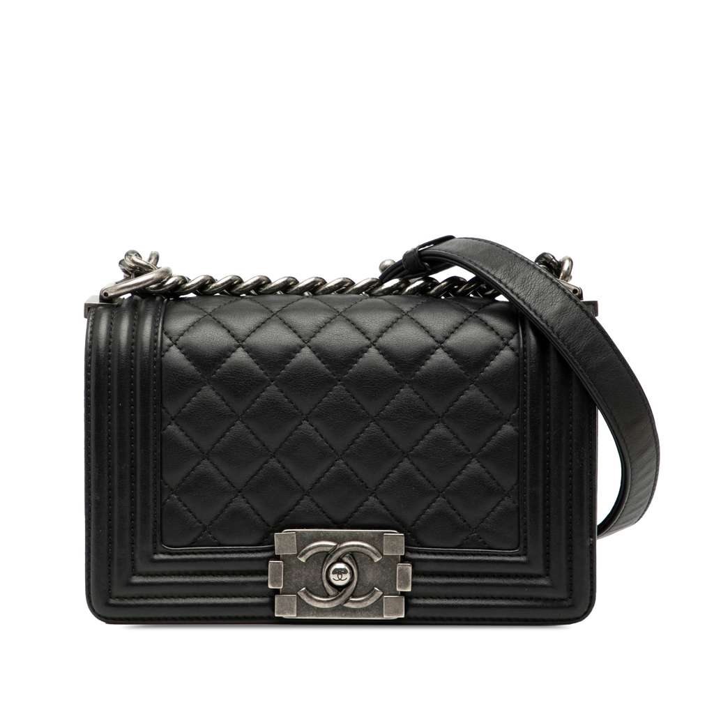 The Boy flap features a lambskin leather body, a silver-tone woven chain strap with leather guard, a front flap with a CC push lock closure, and an interior slip pocket.