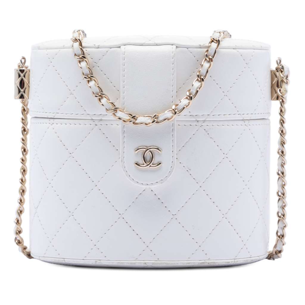 This vanity bag features a quilted lambskin leather body, a leather woven chain link strap, a front flap with a CC snap button closure, and an interior mirror.
