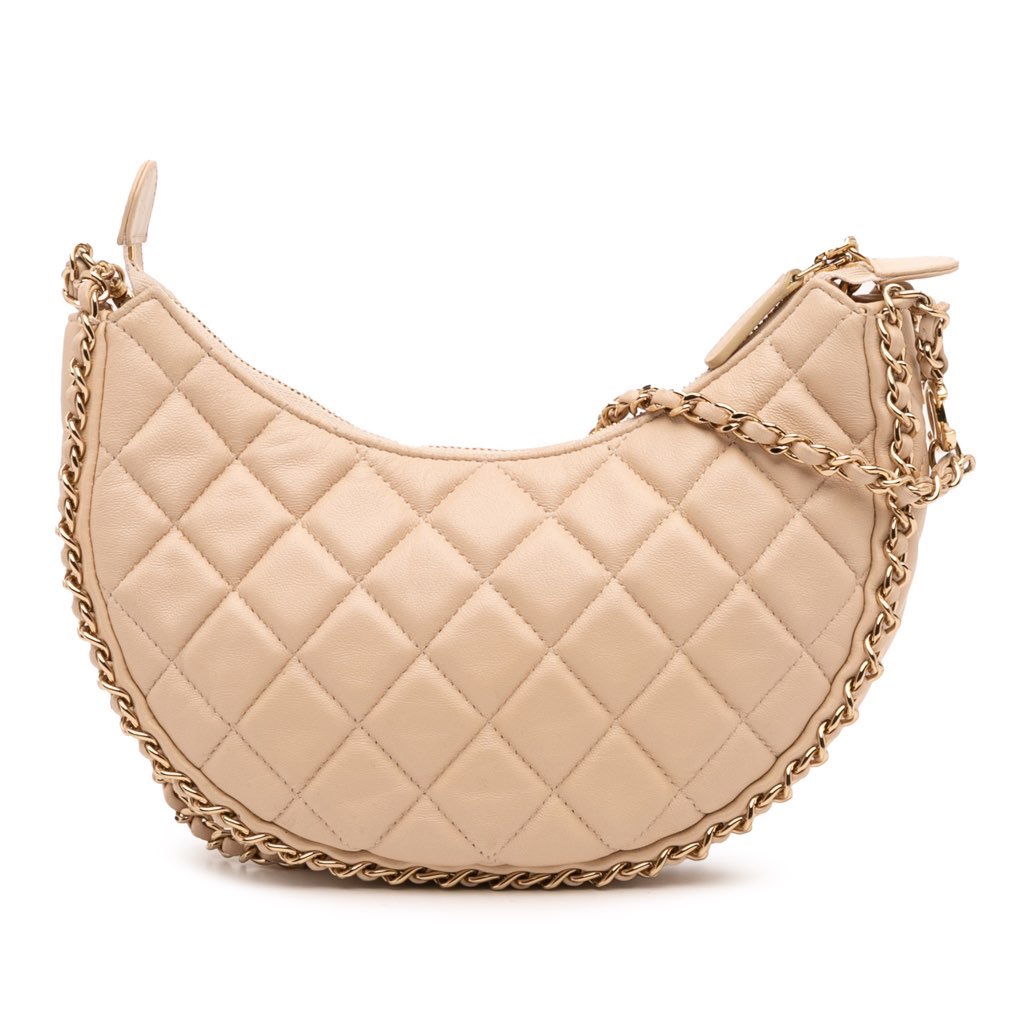 This crossbody bag features a quilted lambskin leather body, a leather-woven chain link strap, and a top zip closure.