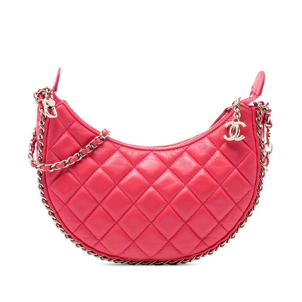 This crossbody bag features a quilted lambskin leather body, a leather-woven chain link strap, and a top zip closure.