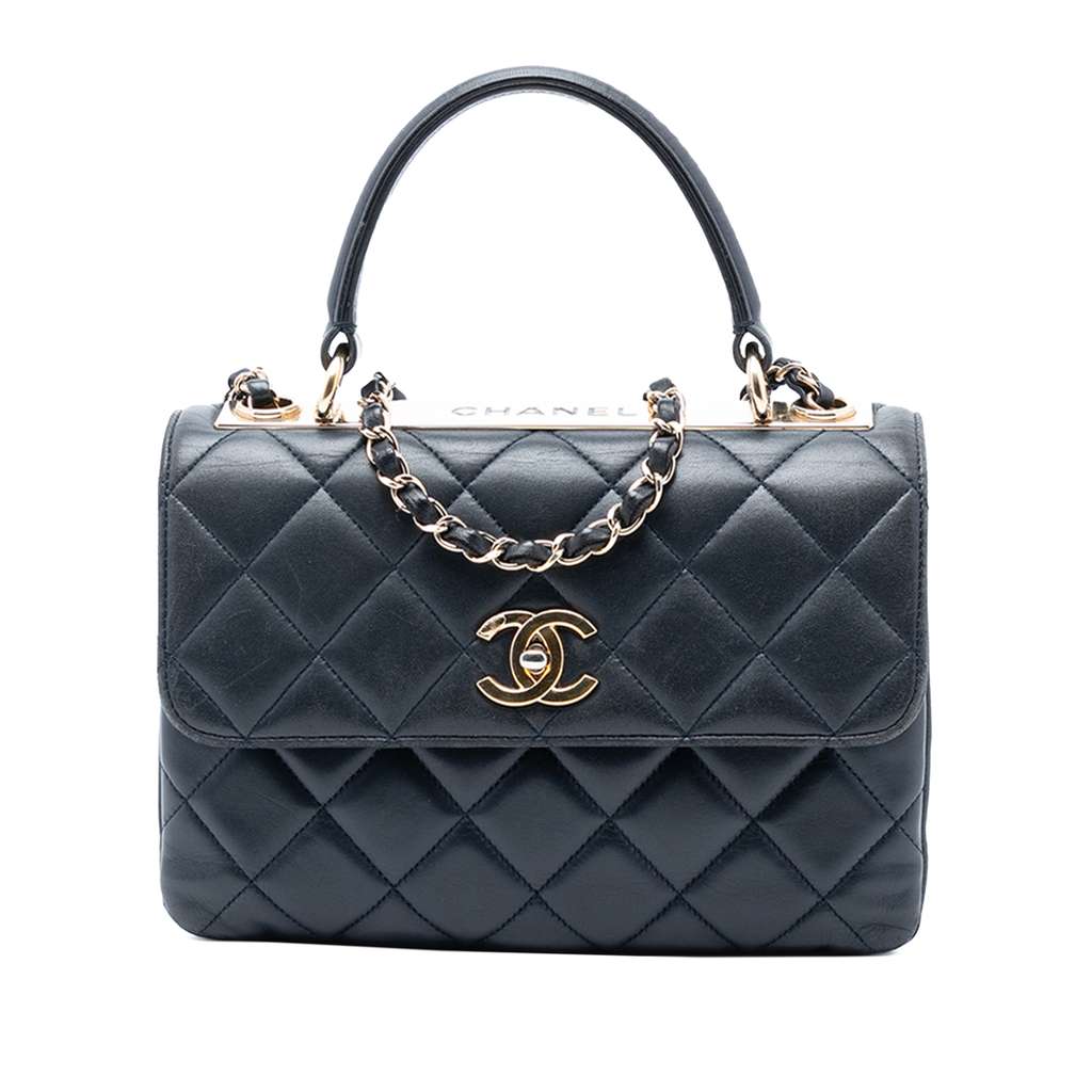 The Trendy CC satchel features a quilted lambskin leather body, a flat leather top handle, a leather-woven chain strap with leather shoulder guard, a front flap with CC turn-lock closure, an exterior back slip pocket, and interior slip pockets.