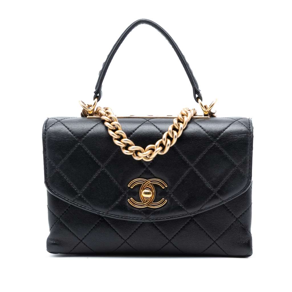 The Trendy Spirit satchel features a quilted leather body, a flat leather top handle, a detachable leather woven chain strap, a front flap with CC turn-lock closure, an exterior back slip pocket, and an interior slip pocket.