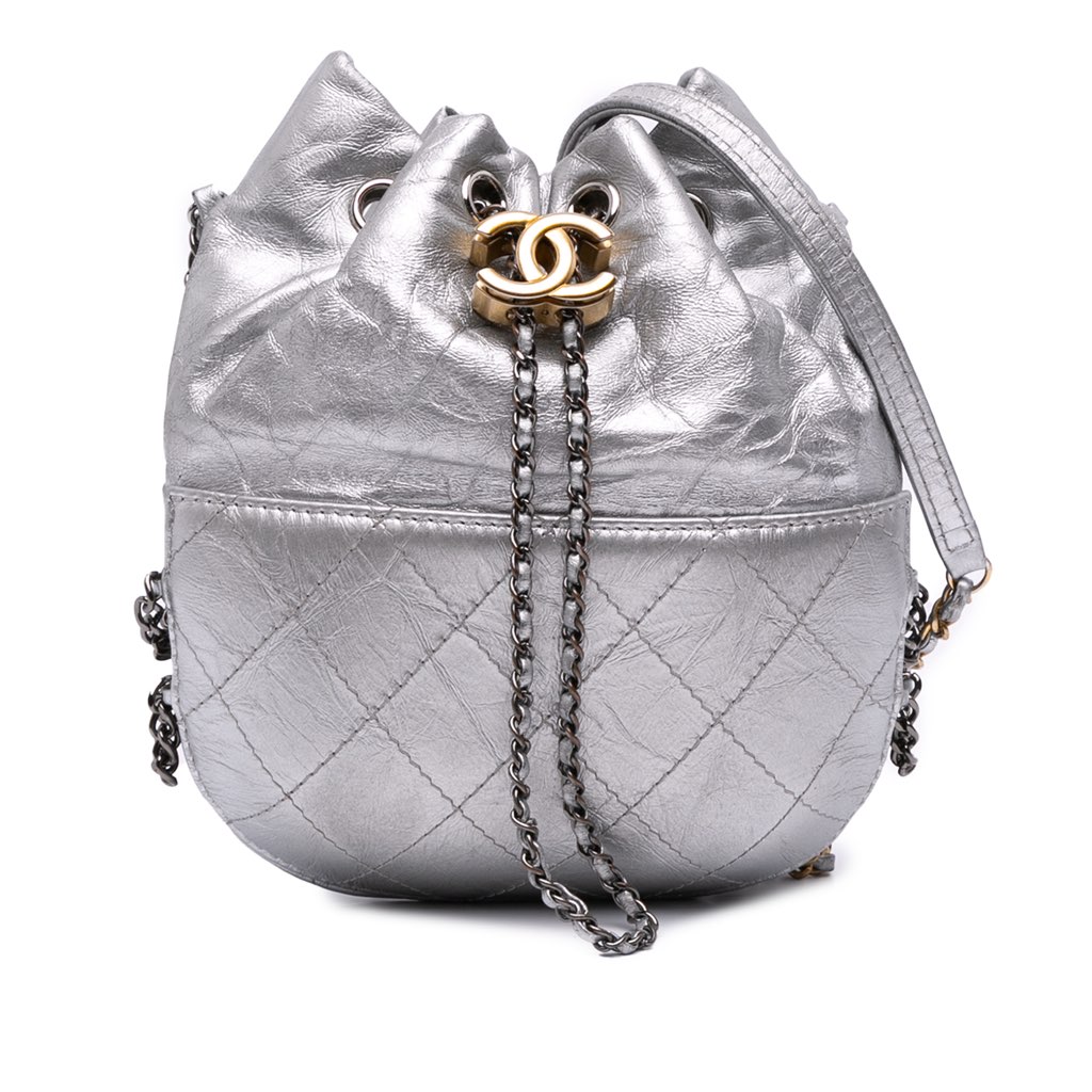 The Gabrielle Bucket Bag features a quilted metallic leather body, a leather-woven chain link strap with leather guard, a top drawstring closure, and interior slip pockets.