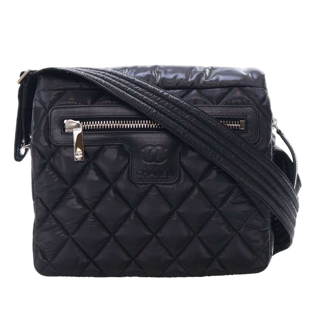 The Coco Cocoon crossbody bag features a quilted nylon body, a flat nylon shoulder strap, a front flap and a top zip closure, a front exterior zip pocket, and an interior zip pocket.