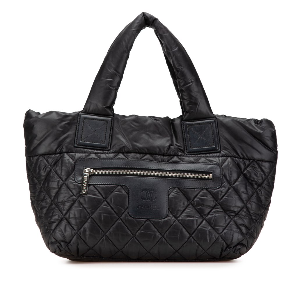 This tote bag features a quilted nylon body, rolled handles, an open top, an exterior front zip pocket, and an interior zip pocket.