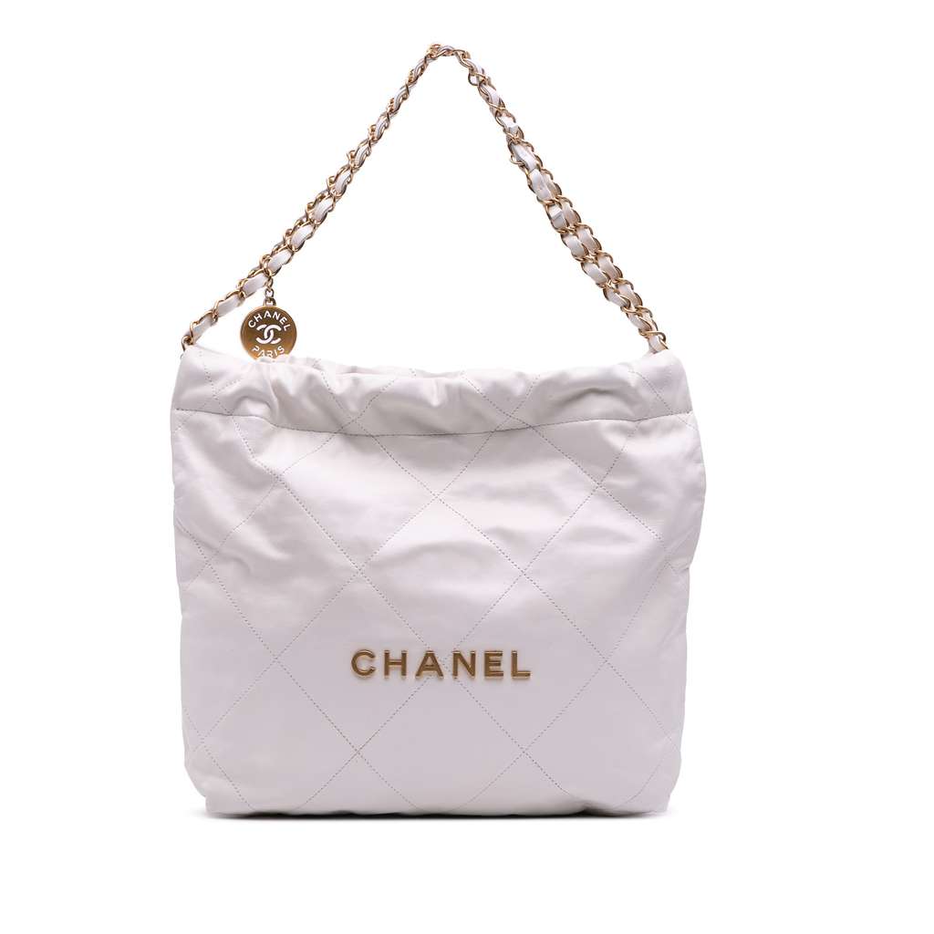 This 22 bag features a quilted shiny calfskin leather body, leather woven chain shoulder straps, a snap button closure, an interior zip pocket, and a detachable zip pouch.