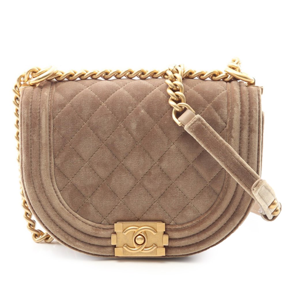 The Boy Messenger Bag features a quilted velvet body, curb chain strap, a front flap with push lock closure, and an interior slip pocket.