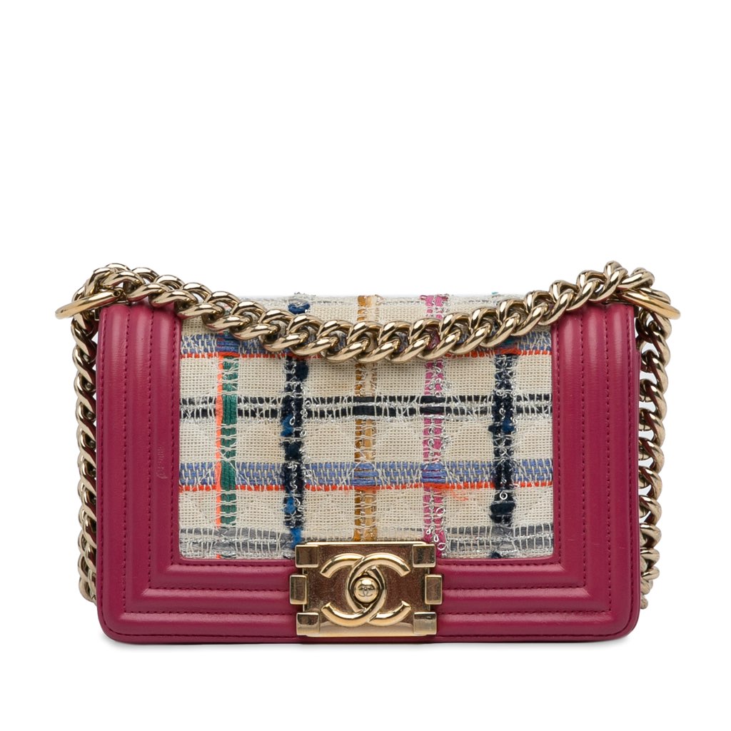 This shoulder bag features a tweed body with leather trim, a front flap with a CC push-lock closure, a curb chain strap, and an interior slip pocket.