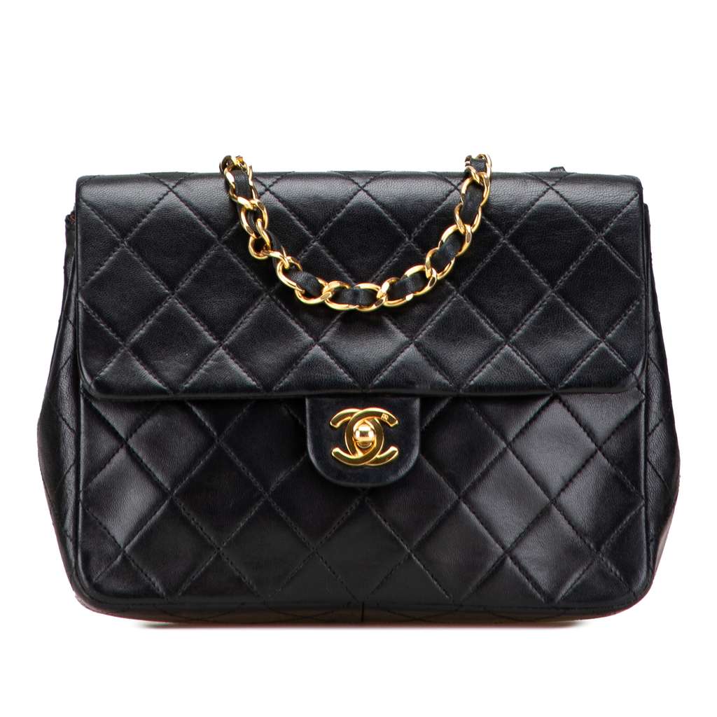 This shoulder bag features a quilted lambskin body, leather woven chain straps, a front flap with interlocking Cs and a twist lock closure, and interior zip and slip pockets.