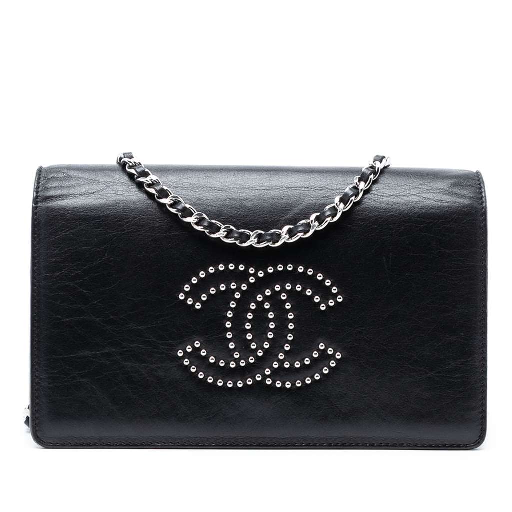 This wallet on chain features a studded lambskin leather body, leather woven chain strap, a front flap with magnetic closure, and interior zip and slip pockets.