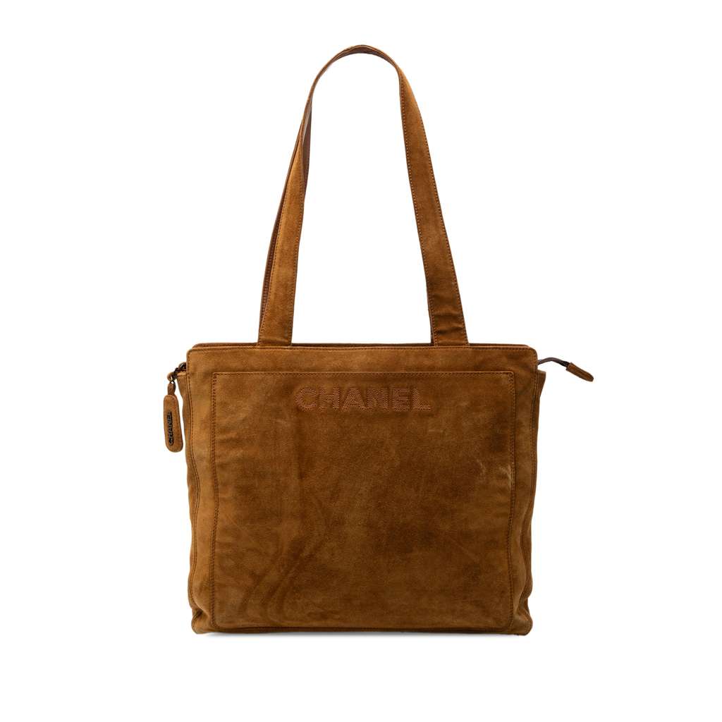 This tote bag features a suede body, flat straps, a top zip closure, exterior front and back slip compartments, and interior zip and pockets.