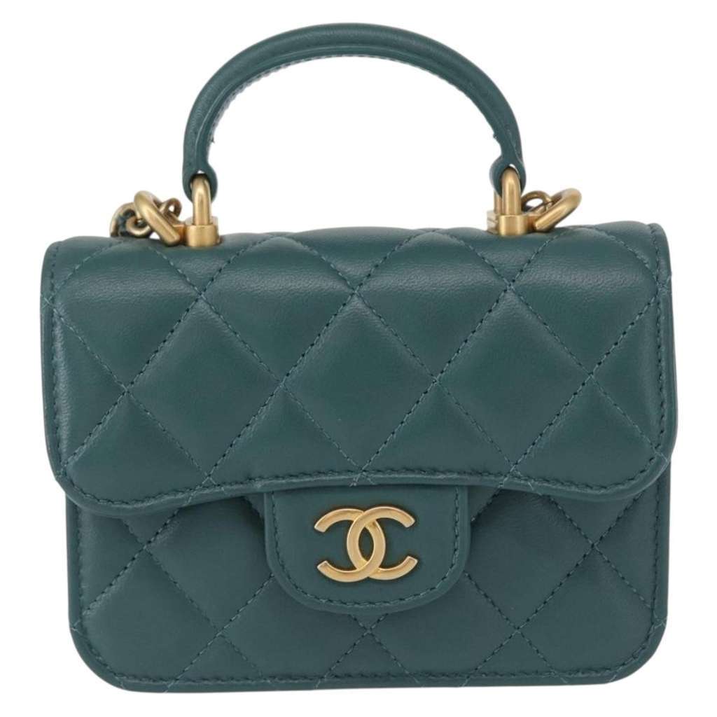Chanel Top Handle Flap Coin Purse with Chain Green Mini Leat