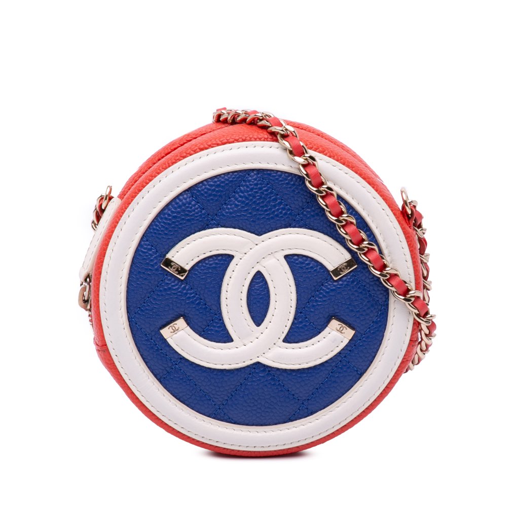 The Filigree crossbody features a quilted caviar leather body, a leather-woven chain strap, a top zip closure, and an interior slip pocket.