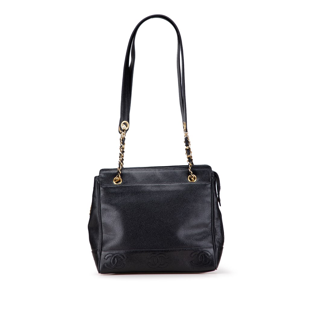 This shoulder bag features a caviar leather body, leather woven chain link straps with leather guard, a top zip closure, an exterior front slip compartment, and interior zip pockets.