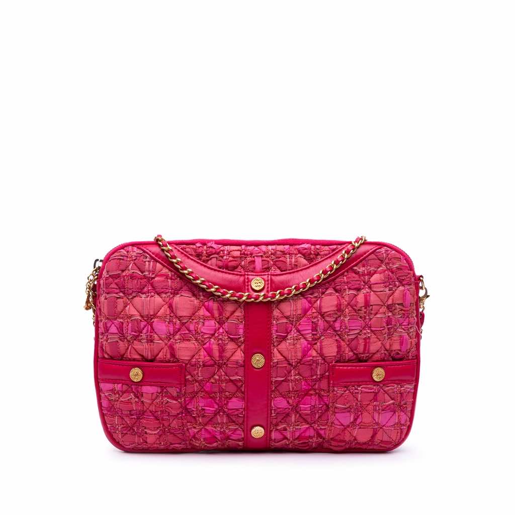 This crossbody features a tweed body with leather trim, a leather woven chain strap, a top zip closure, exterior slip pockets, and an interior zip pocket.
