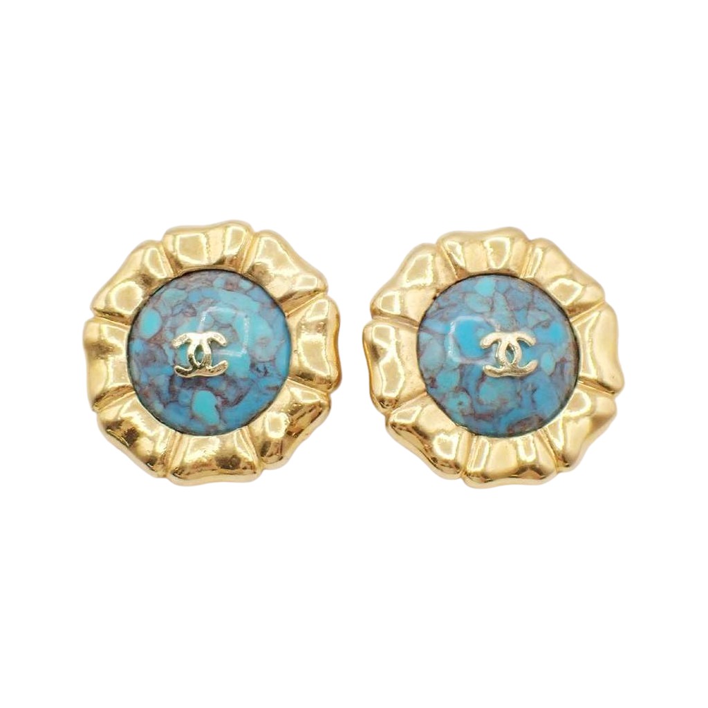 Chanel Vintage CC Round Button Clip-On Earrings Blue