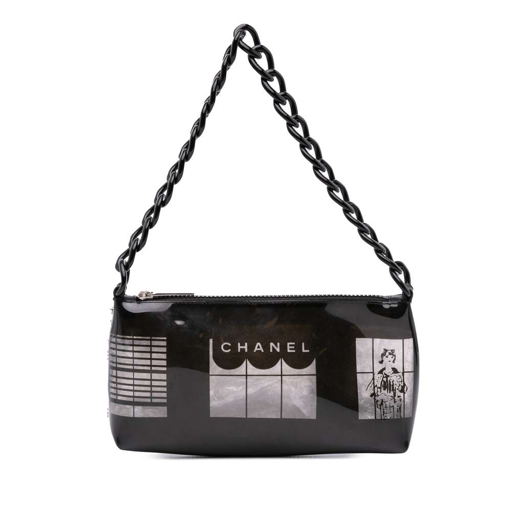 This handbag features a printed vinyl body, a resin chain-link strap, and a top zip closure.