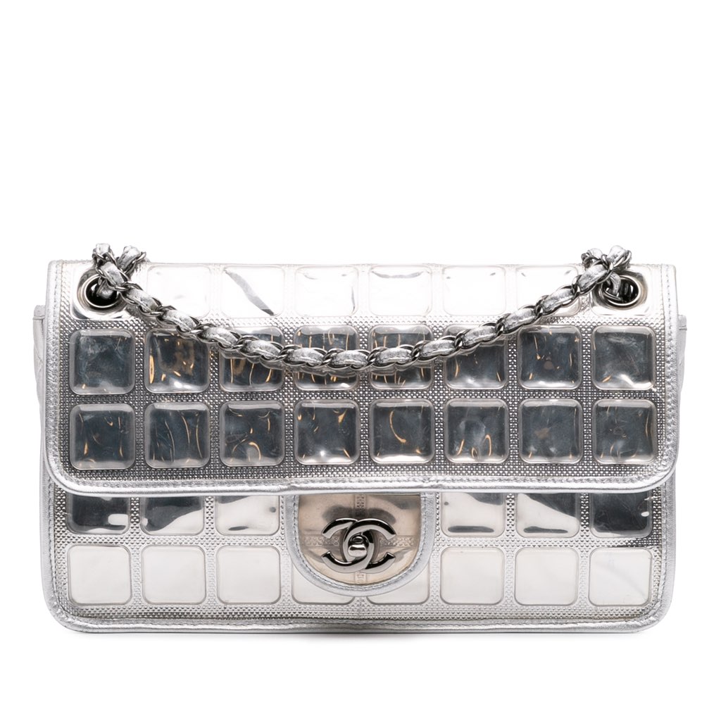 This shoulder bag features a vinyl and metallic calfskin body, a leather woven chain strap, a front flap with a CC turn-lock closure, and an interior zip pocket.