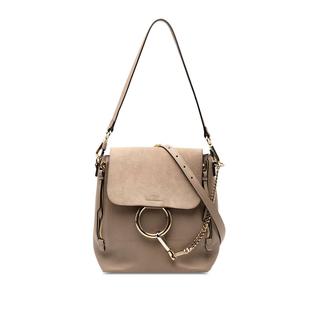 The Faye backpack features a leather body with zip details, adjustable flat back straps, a detachable shoulder strap, a suede front flap with a hook closure, and interior zip and slip pockets.