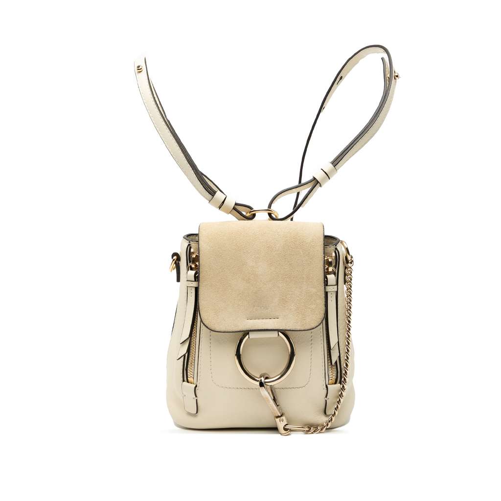 The Mini Faye backpack features a leather body with zip details, adjustable flat leather back straps, a detachable flat leather shoulder strap, a suede front flap with a hook closure, and an interior slip pocket.