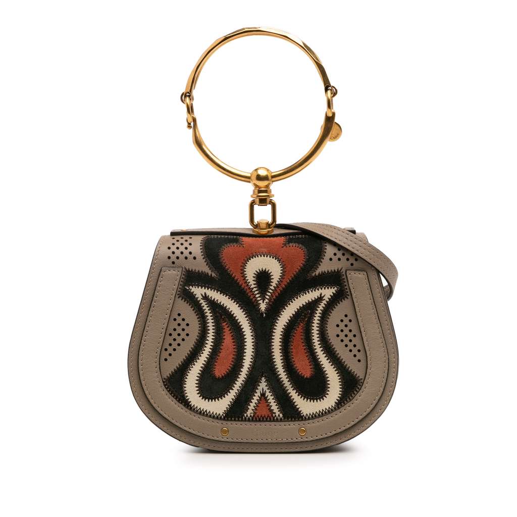 The Nile features a leather and suede body, a metal hoop handle, a detachable flat leather strap, a top flap with magnetic closure, an exterior back slip pocket, and an interior slip pocket.