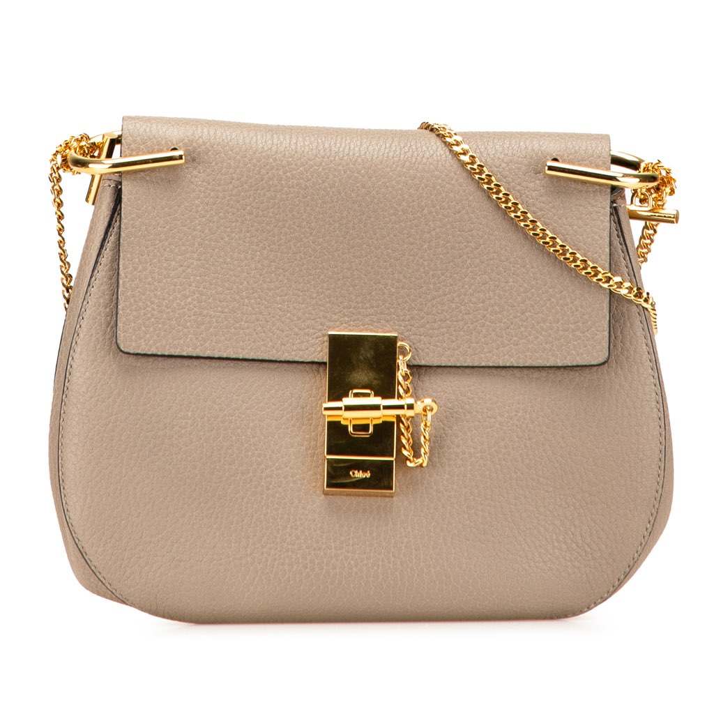 The Drew features a leather body, a gold toned chain strap, a top flap with pin-lock closure, and an interior slip pocket.