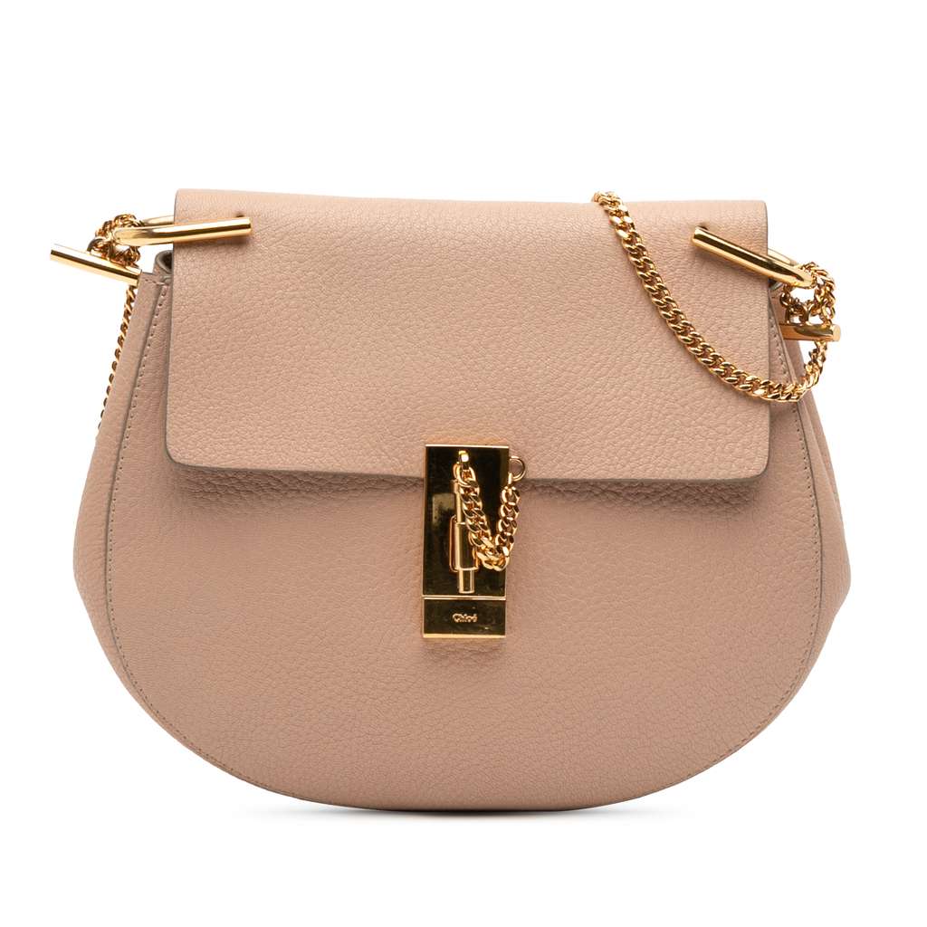The Drew features a leather body, a gold toned chain strap, a top flap with pin-lock closure, and an interior slip pocket.