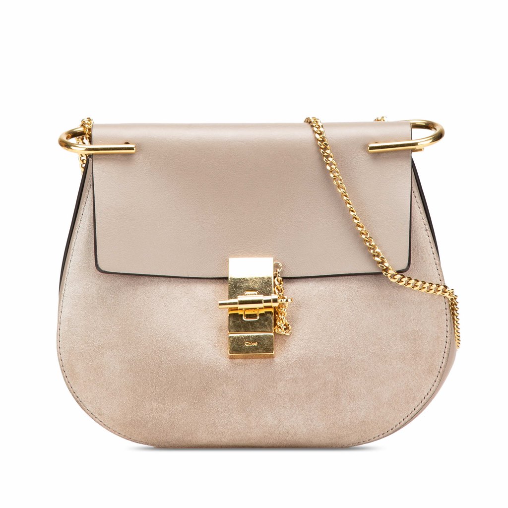 The Drew features a suede and calf leather body, a chain link strap, a front flap with pin-lock closure, and an interior slip pocket.