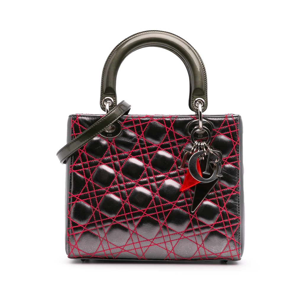 The Medium Lady Dior features a quilted metallic lambskin leather body, structured leather handles, a detachable flat leather strap, a top zip closure, and an interior zip pocket.