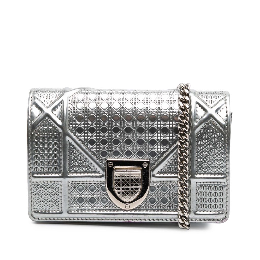 This crossbody bag features a patent leather body, a detachable silver-tone chain shoulder strap, a front flap with a push lock closure, and an interior slip pocket.