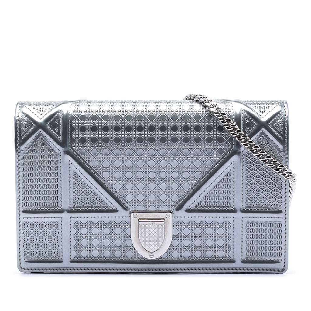 This wallet on chain features a patent leather body, a detachable silver-tone chain shoulder strap, a front flap with a push lock closure, and an interior slip pocket.