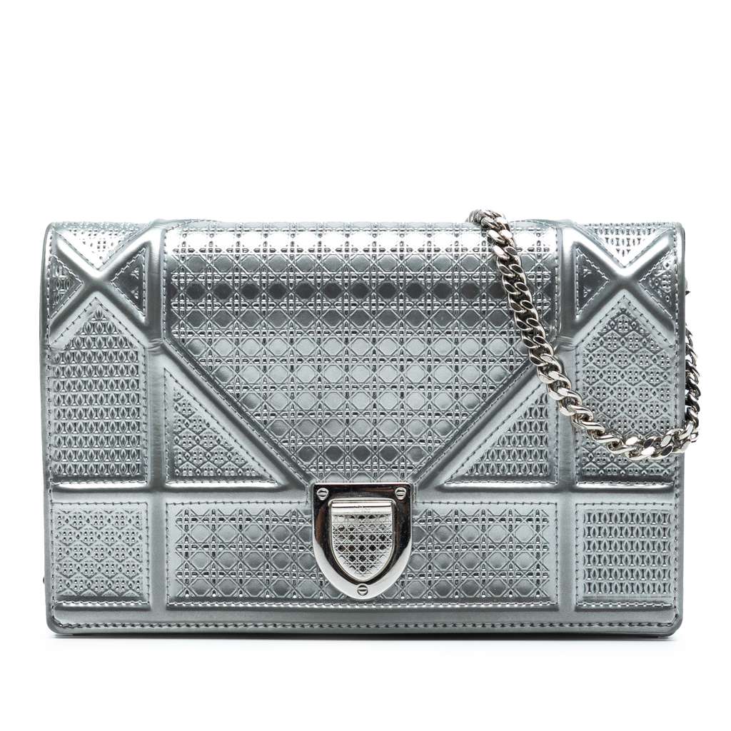 This wallet on chain features a patent leather body, a detachable silver-tone chain shoulder strap, a front flap with a push lock closure, and an interior slip pocket.