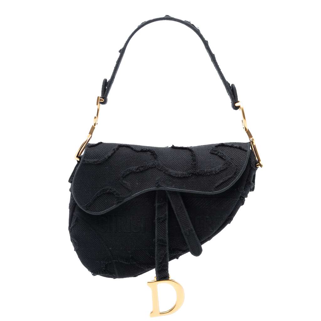 The Saddle bag features an embroidered canvas body, a flat strap, a front flap with magnetic snap closure, and an interior slip pocket.