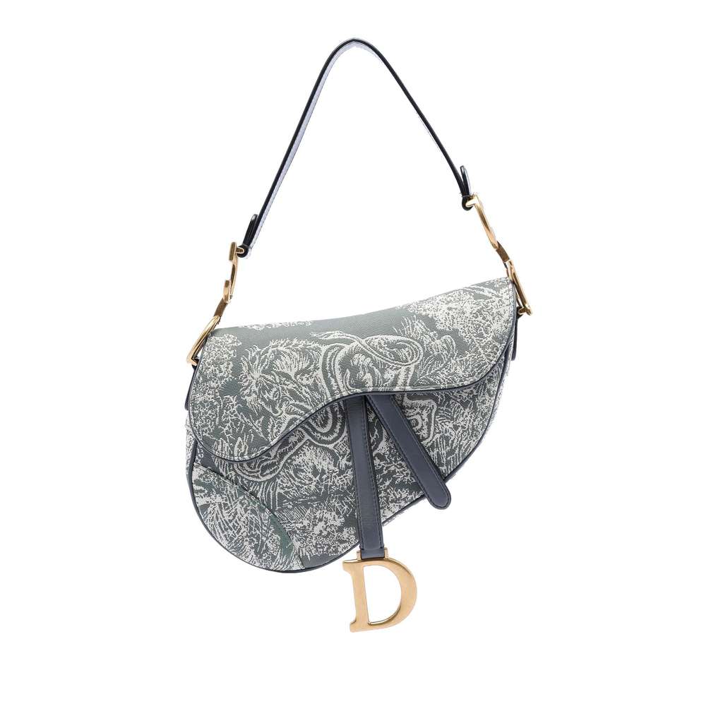 The Saddle features an embroidered canvas body, a flat strap, a front flap closure, an exterior back slip pocket, and an interior zip pocket.