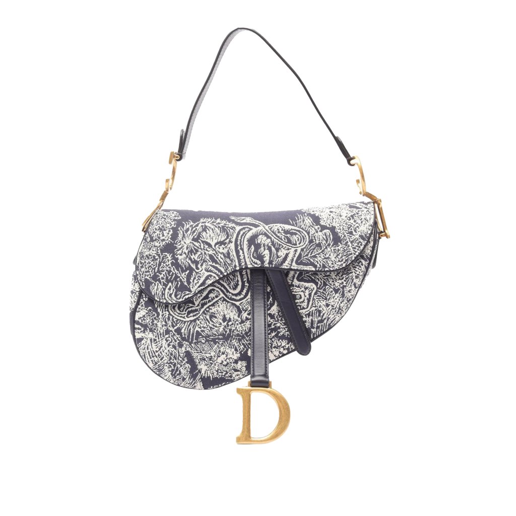 The Saddle features an embroidered canvas body with leather trim, a flat leather strap, a front flap with magnetic snap closure, an exterior back slip pocket, and an interior zip pocket.