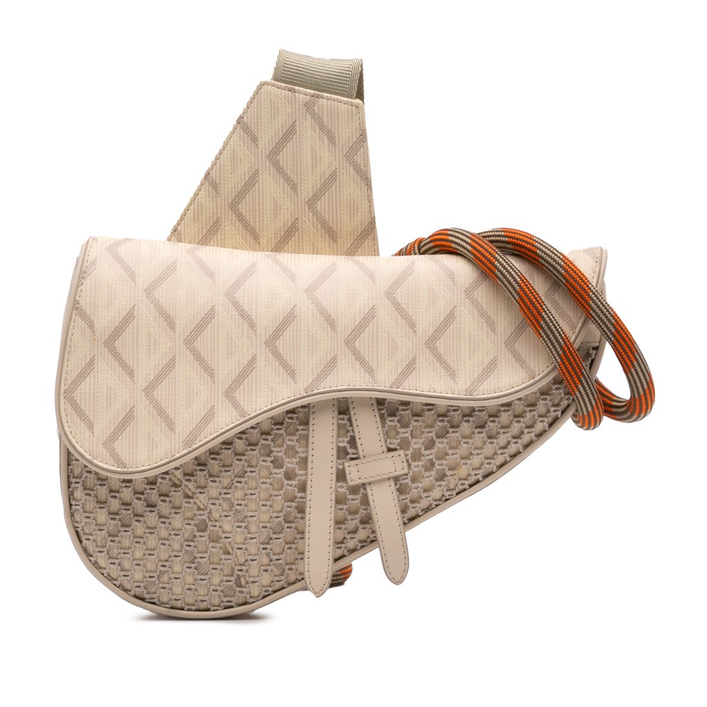 The Saddle features a printed coated canvas body with leather trim and front mesh detail, a rope strap, a front flap with magnetic snap closure, a top zip closure, and an exterior back slip pocket.