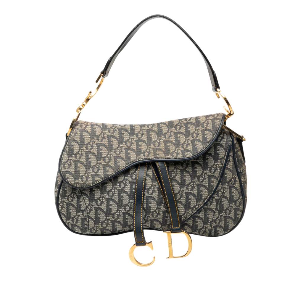 The Double Saddle features a canvas body, a flat leather strap, a front flap with the CD charm, an exterior back pocket, and an interior zip pocket.