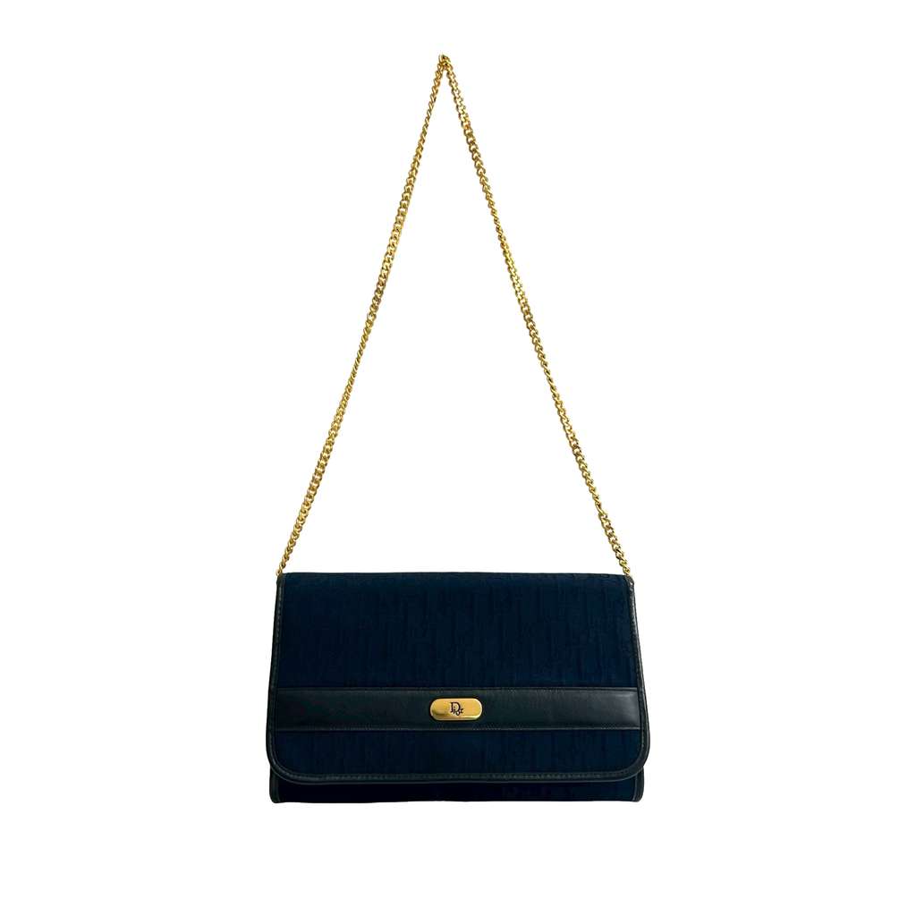 This shoulder bag features a canvas body with leather trim, a chain link strap, and a flap with magnetic snap button closure.