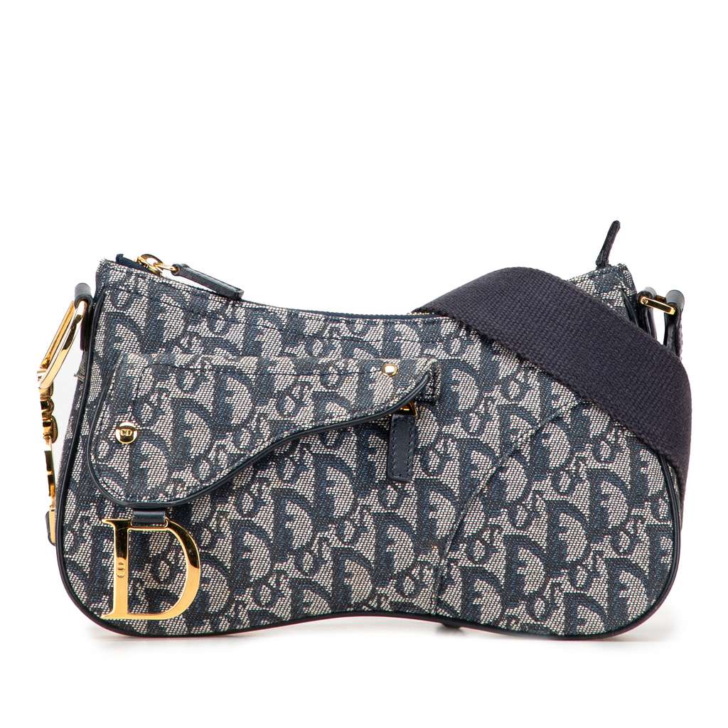 The Double Saddle crossbody bag features a canvas body with leather trim, an adjustable flat canvas strap, a front flap with CD charm, a top zip closure, and an interior zip pocket.