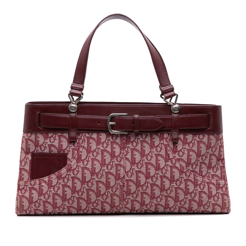 This tote bag features a canvas body with leather trim, flat leather handles, an open top, exterior slip pockets, and interior zip pockets.