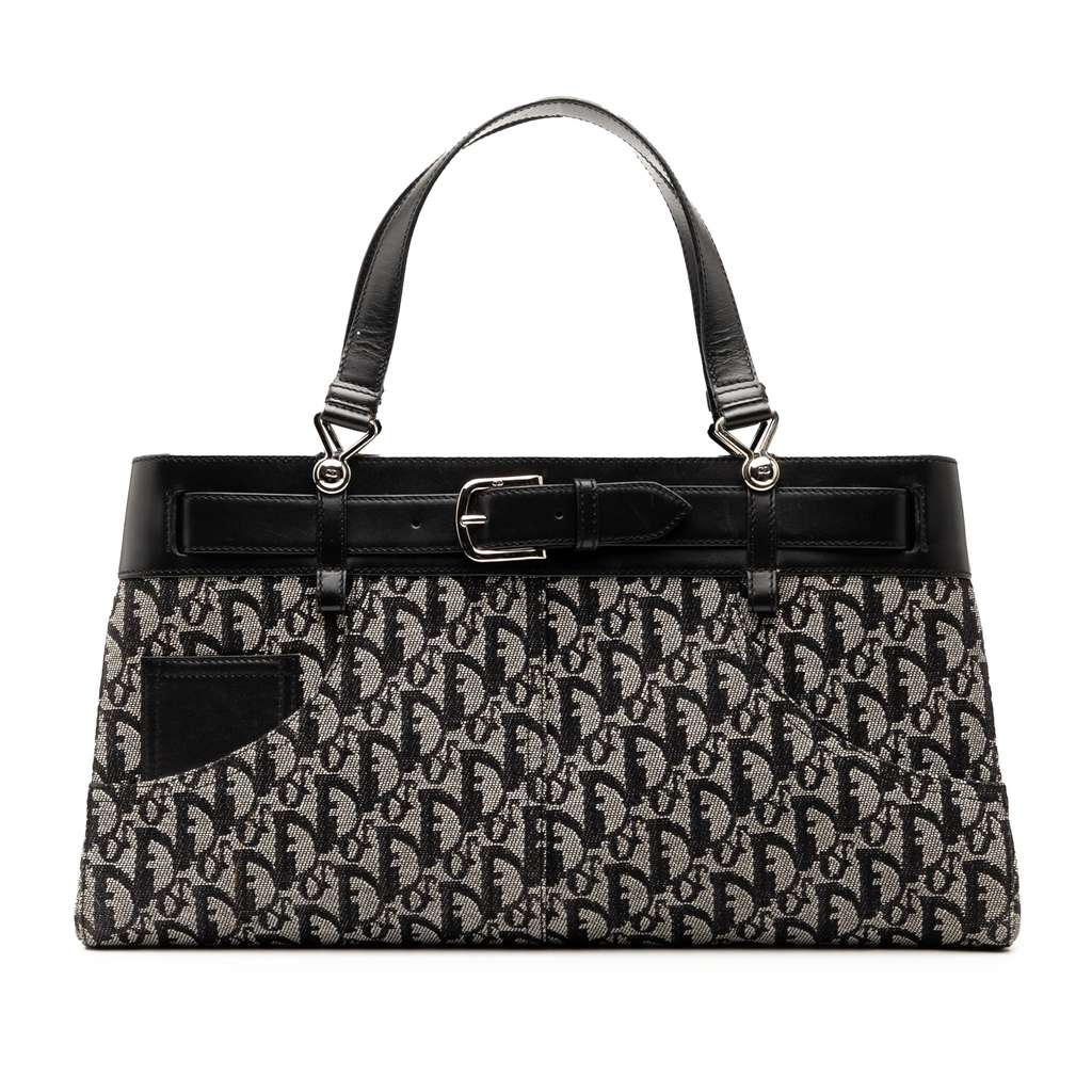 This tote bag features a canvas body, flat leather handles, an open top, exterior slip pockets, and interior zip pockets.