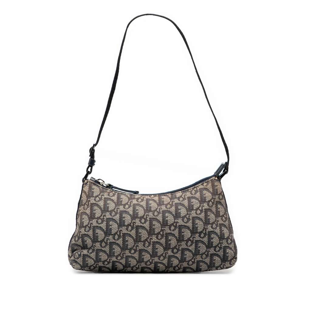 This shoulder bag features a canvas body, a flat shoulder strap, a top zip closure, and an interior slip pocket.