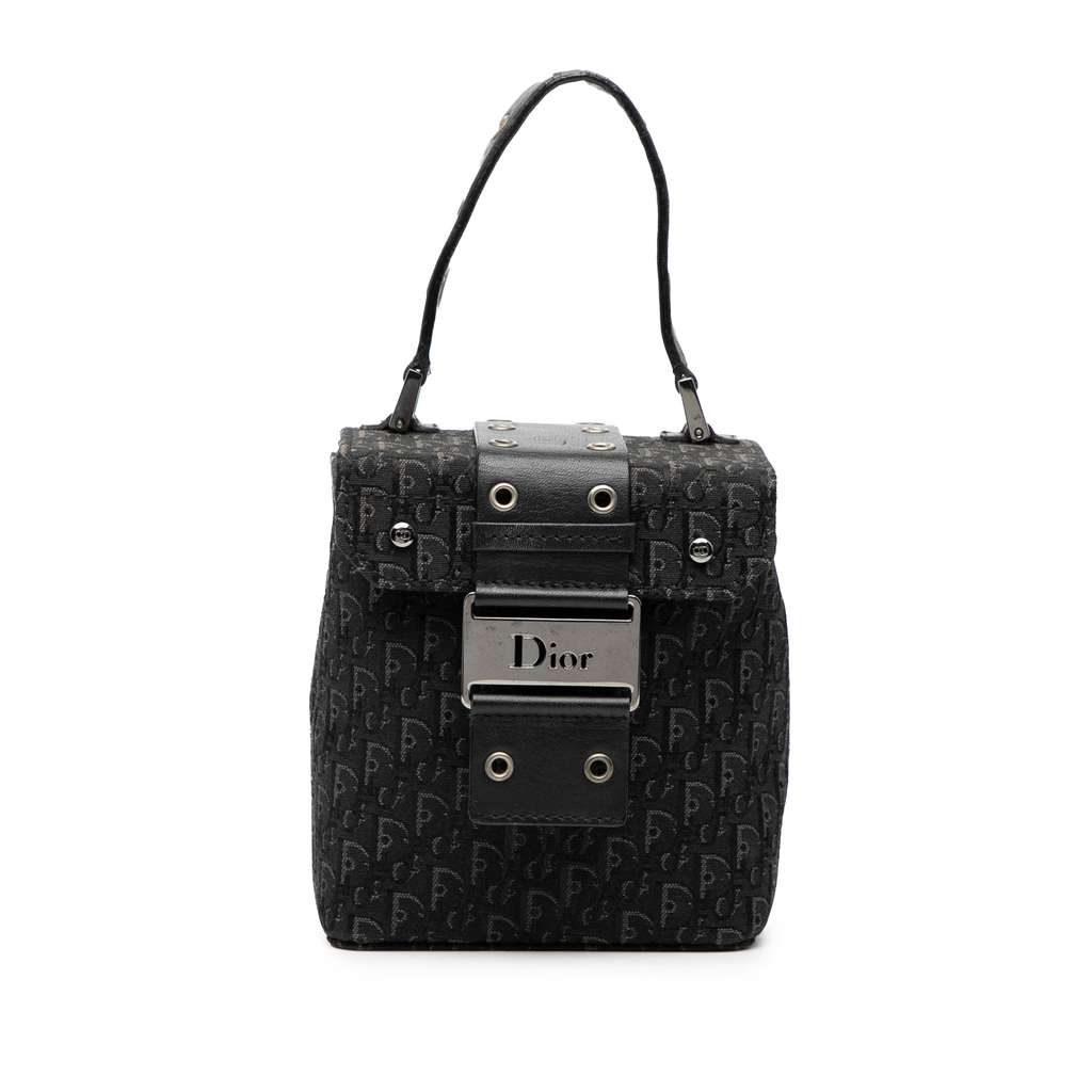 The Street Chic vanity bag features a canvas body, a flat leather top handle, and a top flap with strap detail and magnetic snap closure.