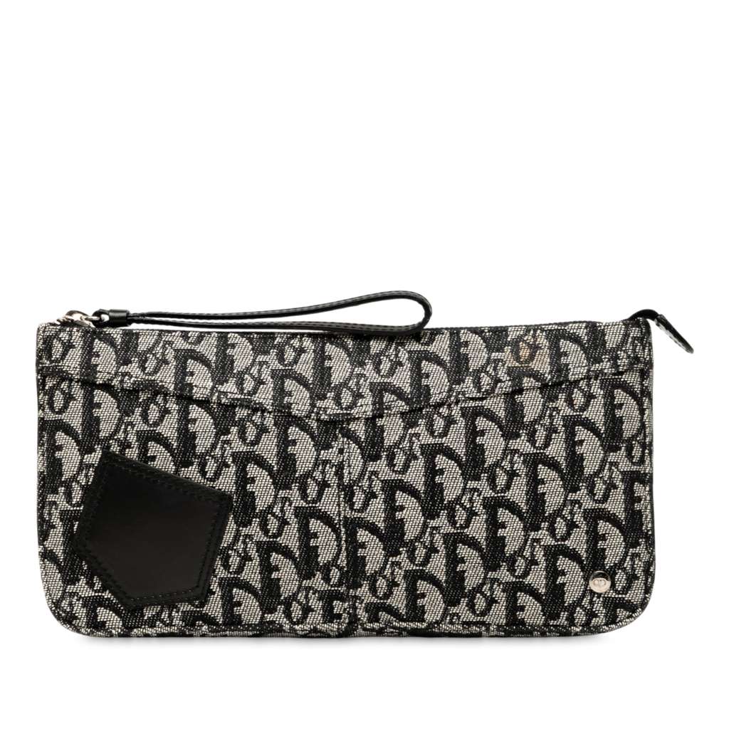 This clutch bag features a canvas body, a flat leather wrist strap, and a top zip closure.