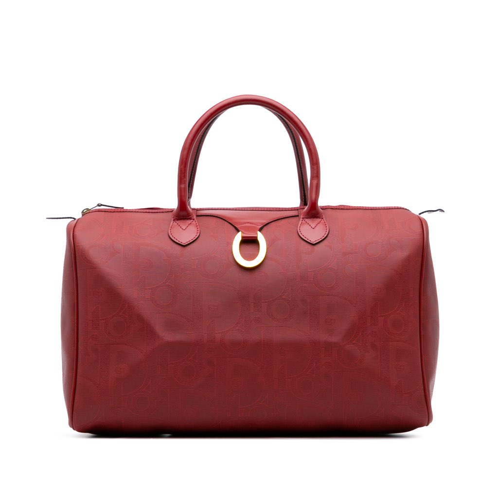 This travel bag features a coated canvas body with leather trim, rolled leather handles, a top zip closure, and an interior zip pocket.