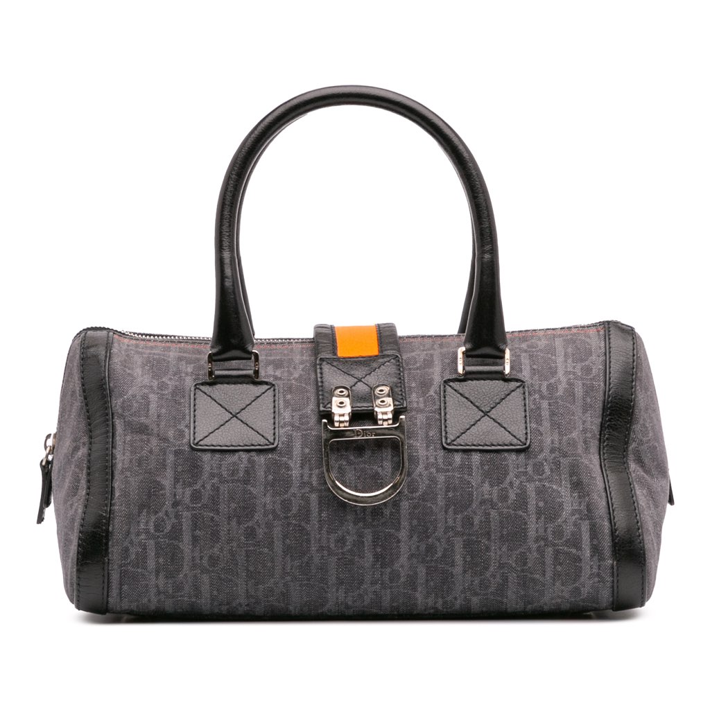 This boston bag features a denim body with leather trim, rolled leather handles, a strap with D hardware, a top zip closure, and an interior zip pocket.