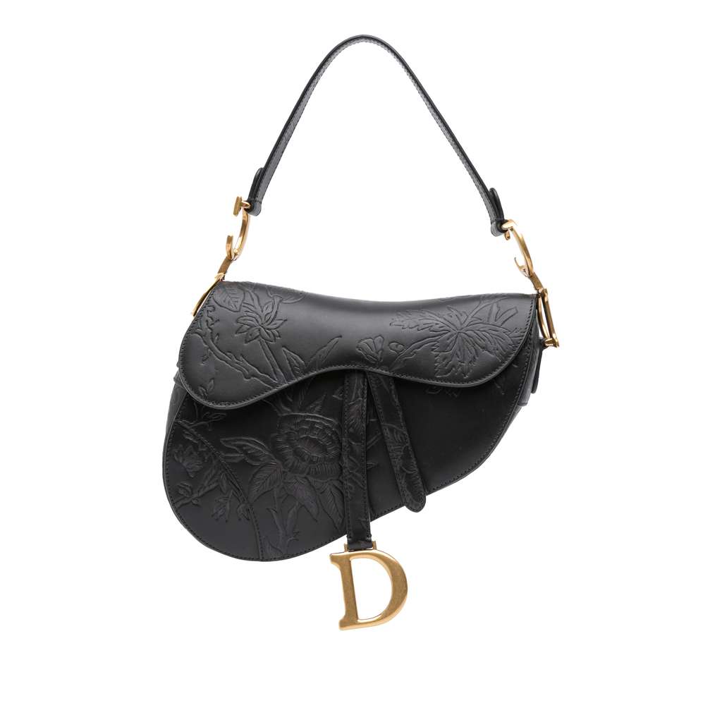 The Saddle features an embossed leather body, a flat leather strap, a detachable flat leather shoulder strap, a flap with magnetic snap closure, and an interior zip pocket.