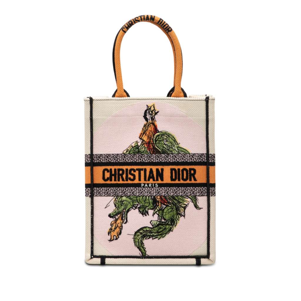 This tote bag features an embroidered canvas body, rolled handles, and an open top.