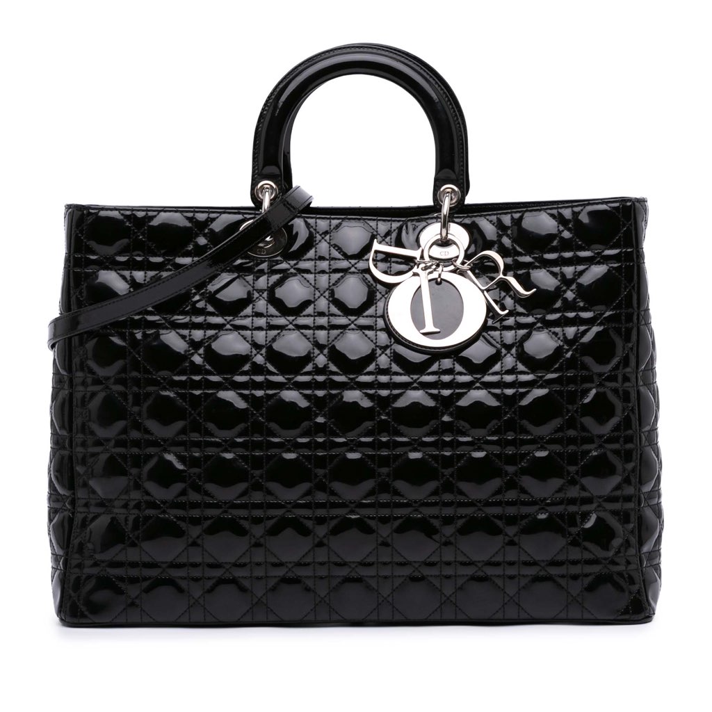 The Lady Dior features a quilted patent leather body, flat leather top handles, a detachable flat strap, a top zip closure, and an interior zip pocket.