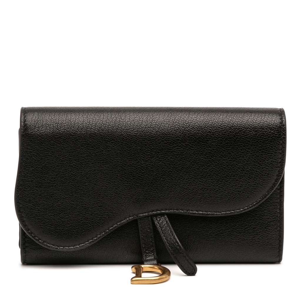 This wallet features a leather body, a flap with a snap button closure, and interior zip and slip pockets.